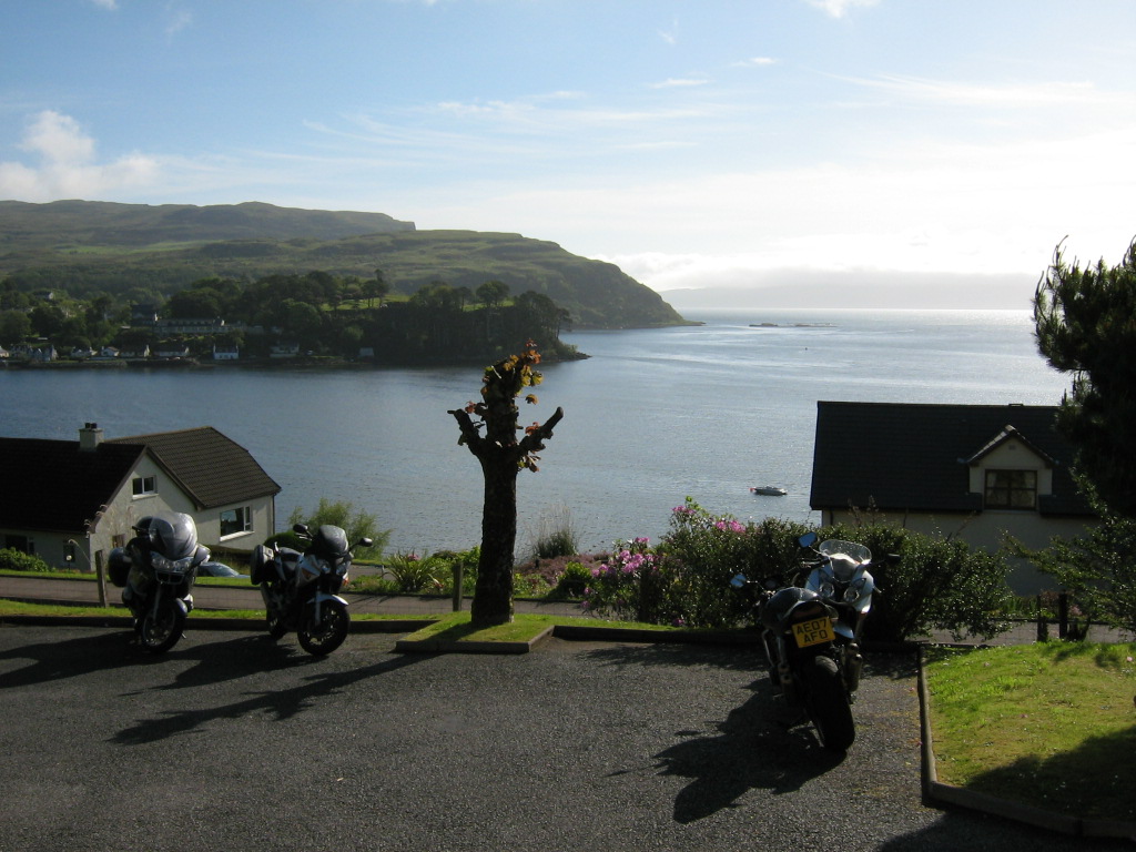 The weather was fantastic. Really sunny and the view of Portree from the B & B living room was amazing. After a nice breakfast we set off at around 10am. The Isle of Skye is a lovely place - it looked totally different with the sun out. We stopped near a big waterfall to take some pictures and pulled up right next to a dead decomposing sheep - not what Nig wanted with a monster hang-over!