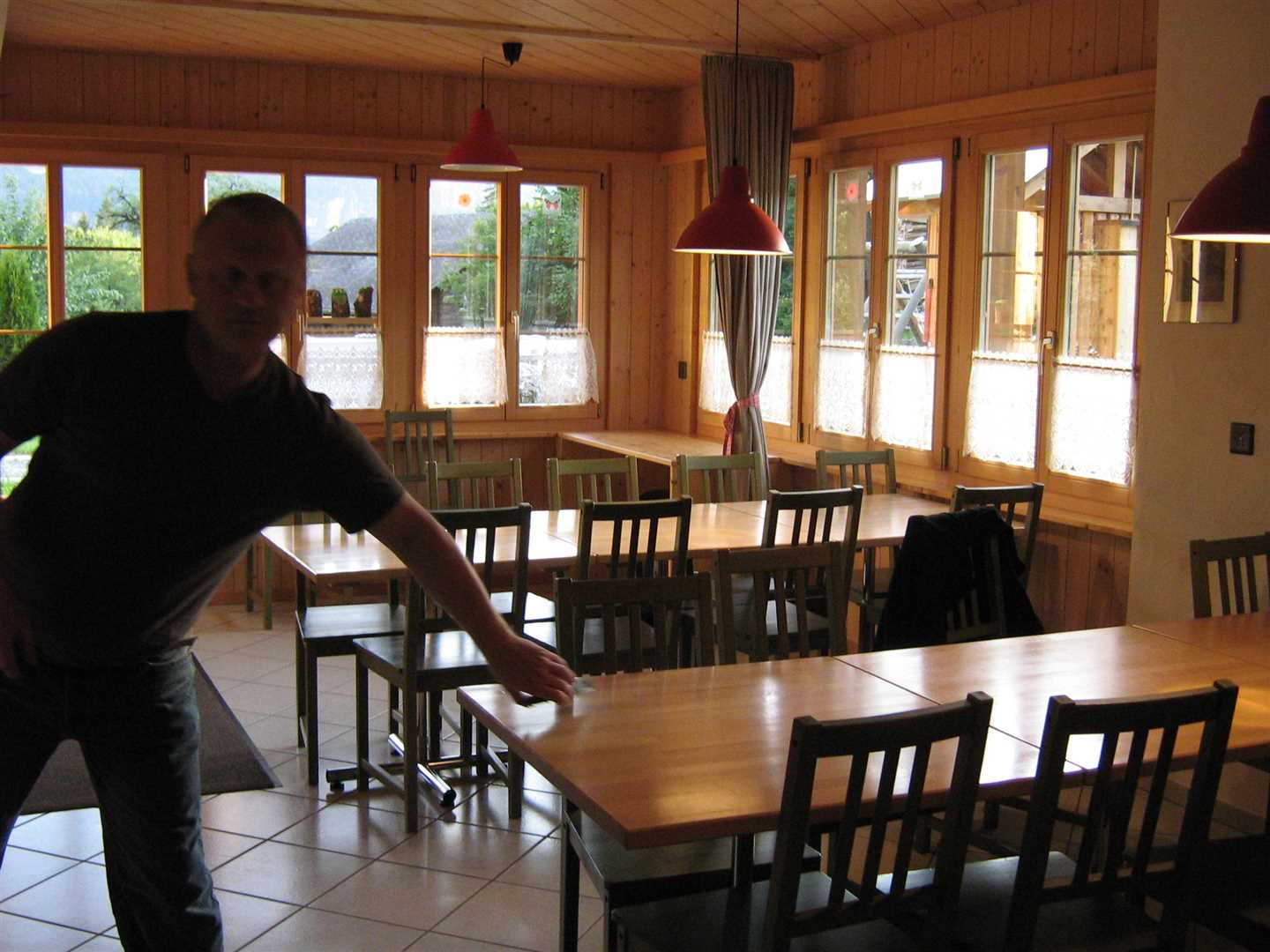 Our camp-site (Camping Hofstatt-Derfli) was very nice. We were still quite high up so we had stunning views of the mountains dotted with a few log cabins and there was a lovely smell of pine drifting in the air. The facilities on-site were also excellent. Everything was inside a large wood lodge. The toilets and showers were the best we'd seen on this trip, there was a room for washing-up and washing your clothes, and there was a heated living room with lots of table so you could eat inside if it wasn't so nice outside.