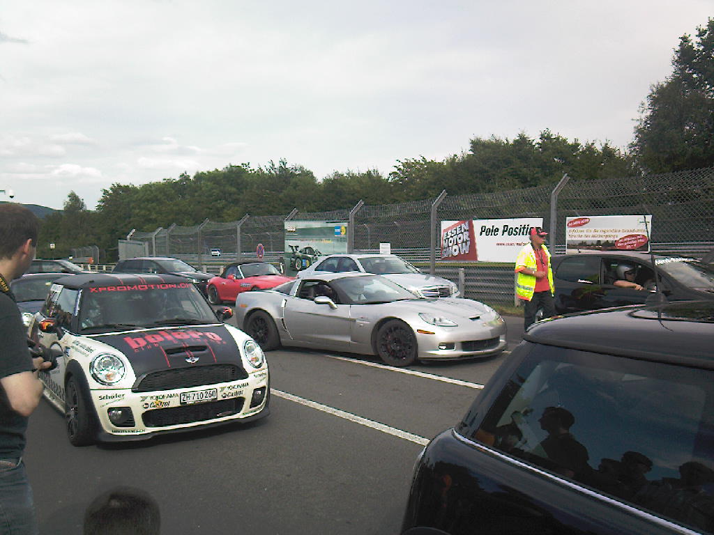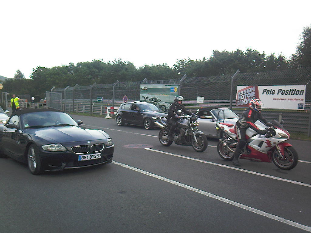 We chilled out for a bit and then had a very leisurely ride to the 'ring, following our new-found companions. We got to the 'ring at around 4:30, bought our tickets (75 euros for 2 laps each) and watched a couple of SLKs being tested by Mercedes, it was very impressive to watch them shoot past on the long straight. While we were waiting the marshals had spotted the after-market pipes on the CBRs and ZX10R we had turned up with and asked if they could test the sound levels. The 'ring has a strict 100db limit, a luckily for these guys their bikes just scrapped in, the ZX10R being exactly 100db! I was very impressed with the marshals though - they are friendly, helpful and just want you to enjoy yourself.