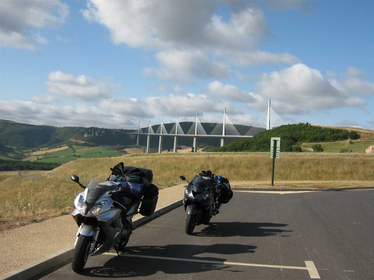 We set off and headed for the Millau Viaduct. We initially went to the viewing area for some photo's and then headed over the bridge. It was around 3.80 euros each for us to cross the bridge, we took it steady going across and enjoyed the amazing view. Then we stopped just over the bridge and Nig took a couple of pictures of the bikes with the bridge in the background.
