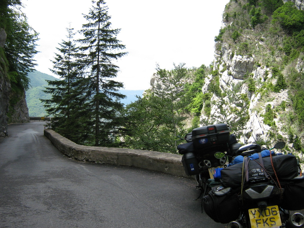 The road we had been on was quite nice with fast flowing bends, but as soon as we turned off the road became amazing, certainly one of the best roads of the trip. It initially twisted it's way along the valley between then mountains, then started to climb and climb up the side of one of them. In between the many hairpin bends were sections of glorious twists and turns, all the while with stunning scenery which got better and better as we climbed.