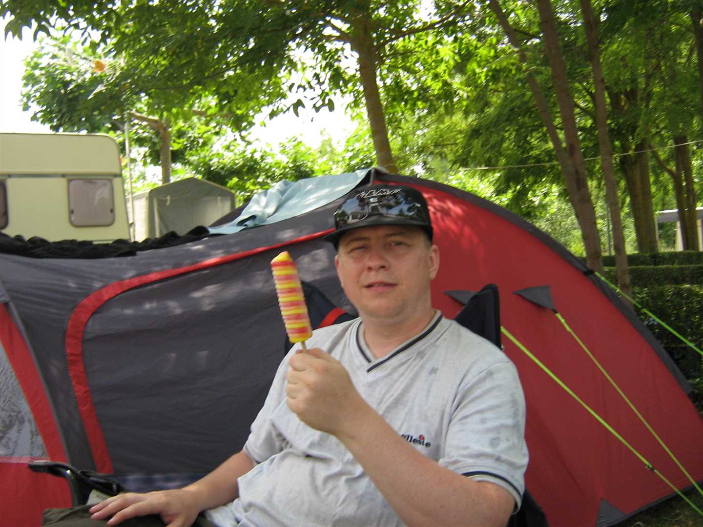 The camp-site was quite nice but the ground was very hard and we ended up bending a lot of our pegs. There were sprinklers on to try and keep the ground usable so after we had pitched our tents we stood under the sprinklers to cool down a bit!
