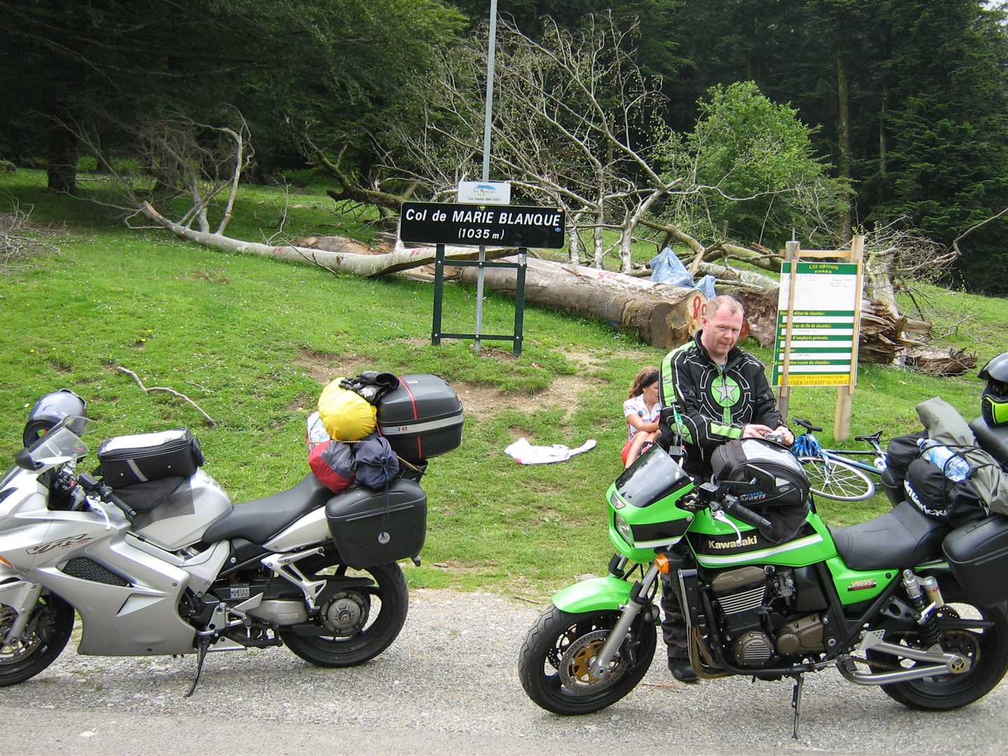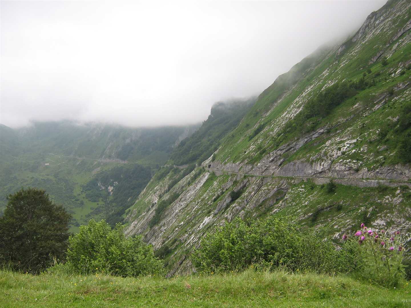 Just as last year, as soon as we reached the summit and crossed into France the weather took a turn for the worse. Dense cloud reduced visibility to next to nothing. Luckily the cloud cover wasn't too thick and we were soon below it as we dropped down the other side. The condition of the road was another problem - a lot worse than last year. It had very large pot holes, many very large cracks, lots of rubble and was covered in cow poo, which with the damp conditions made it treacherous. It was a hard ride to the bottom of the pass so we pulled into a cafe at the bottom and had a very very strong cup of coffee.