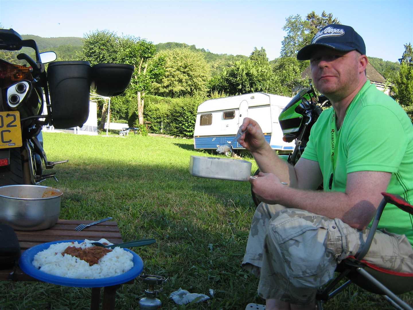 As early evening set in we went for a walk into Castillon. We found a mini-market and bought some eggs and bread for breakfast and of course we had to get they by now traditional ice-cream, then returned to the tents for a curry and rice and a shower before returning to Castillon for a few beers.