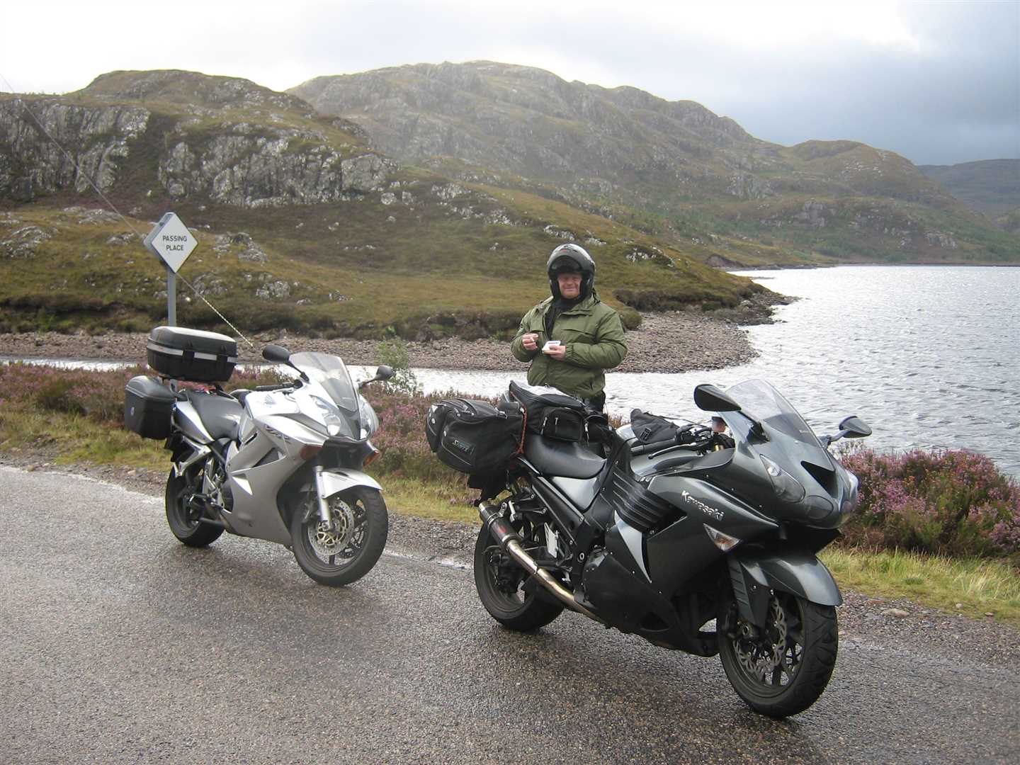 Shortly after leaving the petrol station a police car coming very fast the other way went through a large puddle just before it passed Nig. A large wave completely engulfed the already pretty angry Nig. He was not amused, not amused at all. Initially he was going to chase after the police car and give him a piece of his mind, but instead we stopped for a while to allow Nig to calm down a lot. Luckily the scenery helped, it really is a very nice part of the world in them parts.