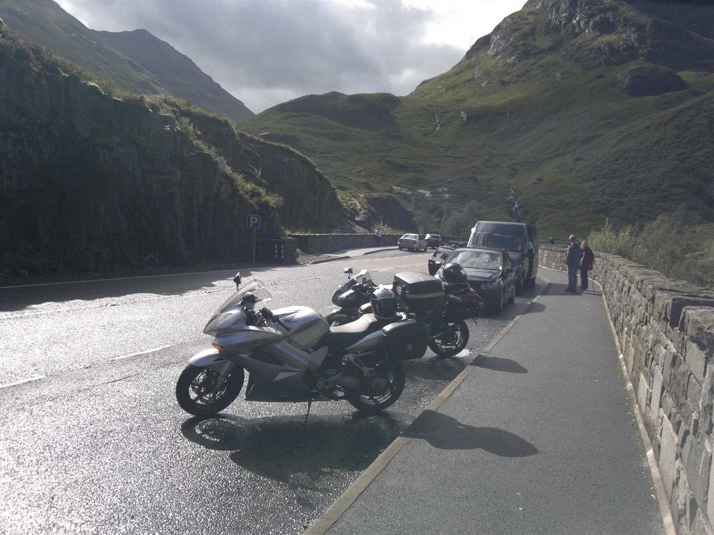 After looking around the castle and taking a lot of pictures we carried on. The weather was still largely dry but with scattered showers and fairly cold. Heading towards Glen Coe on damp roads I started overtaking a car when my front wheel began to slide. I thought I was under the car when it suddenly gripped again, the bike snapped to the right allowing me to overtake the car, then at the next roundabout, still a bit puzzled as to why my front-end had slide, as I was accelerating steadily away the rear slid. I wasn't happy as I basically had lost all confidence in the grip levels of my bike. I took it very steady with all changes of direction from that point on.
