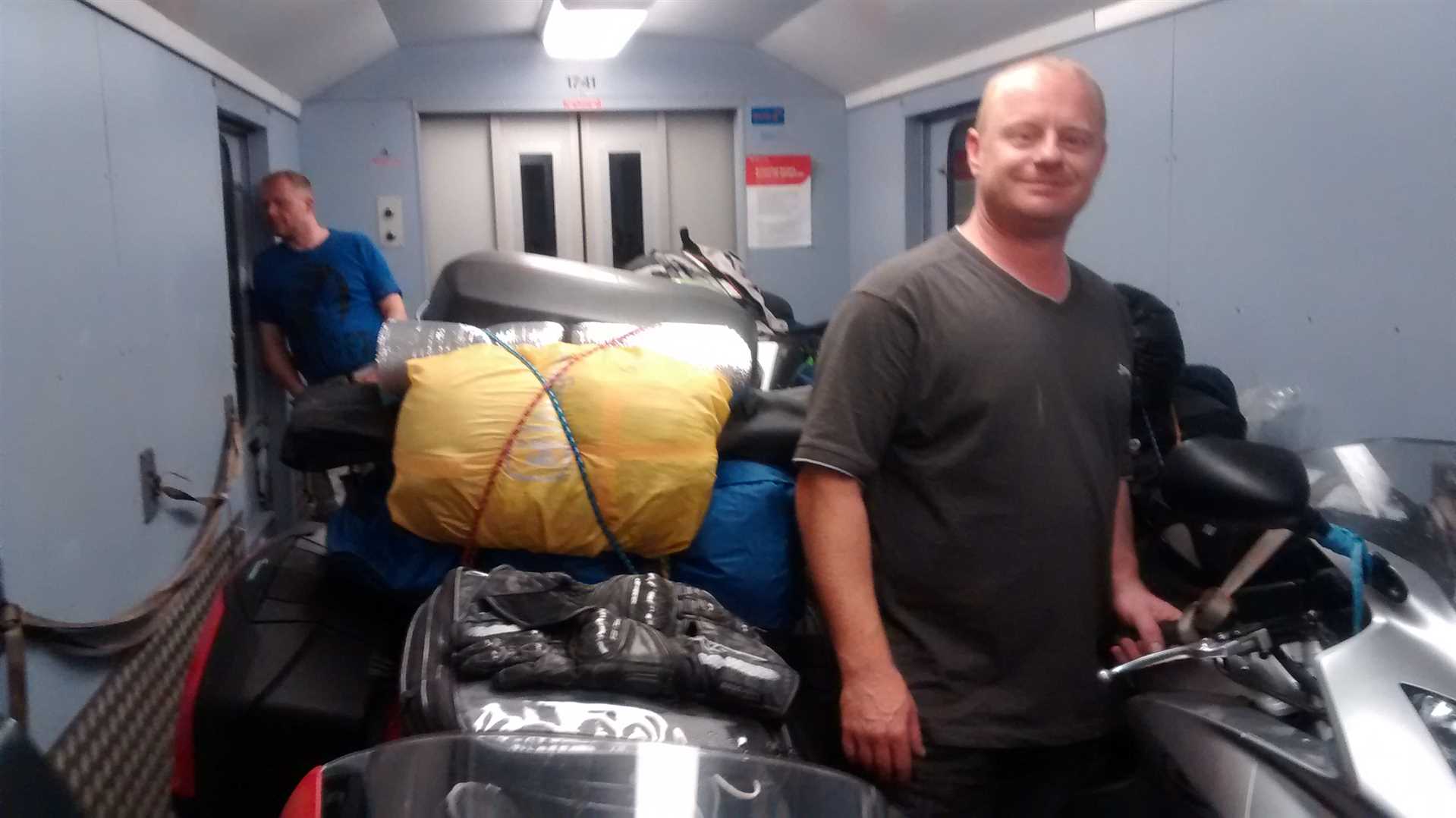 We bought our tickets and then were directed to ride our bikes along to the far end of the platform as the motorcycle carriages were on the front of the train. The train arrived and we rode our bikes on. It was a wierd experiance as none of us had ever done anything like this. We parked the bikes up and then there were seats in the next carriage up.