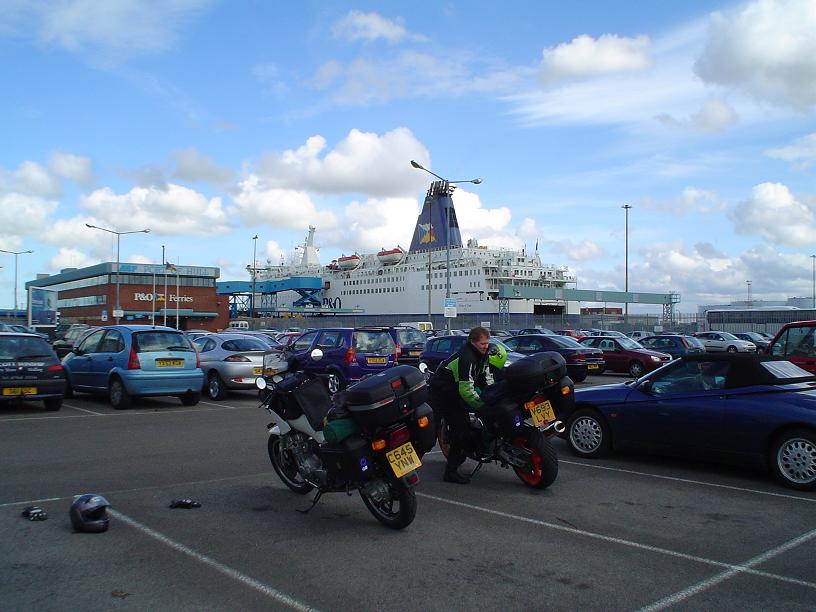 We decided to push onto the port anyway and put the bike on the ferry, even if it was still leaking as we could then get it sorted in Holland and the trip would still be on. I adjusted the overflow pipe so it was pouring onto my boot rather than the back wheel and then rode the 2 or 3 miles to the docks.