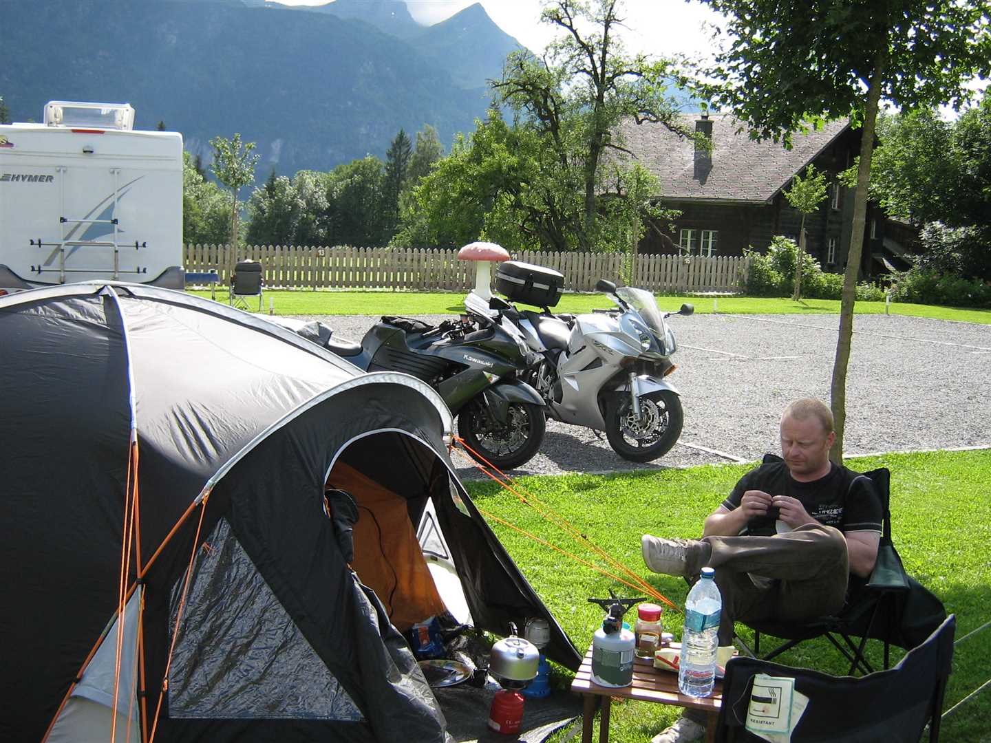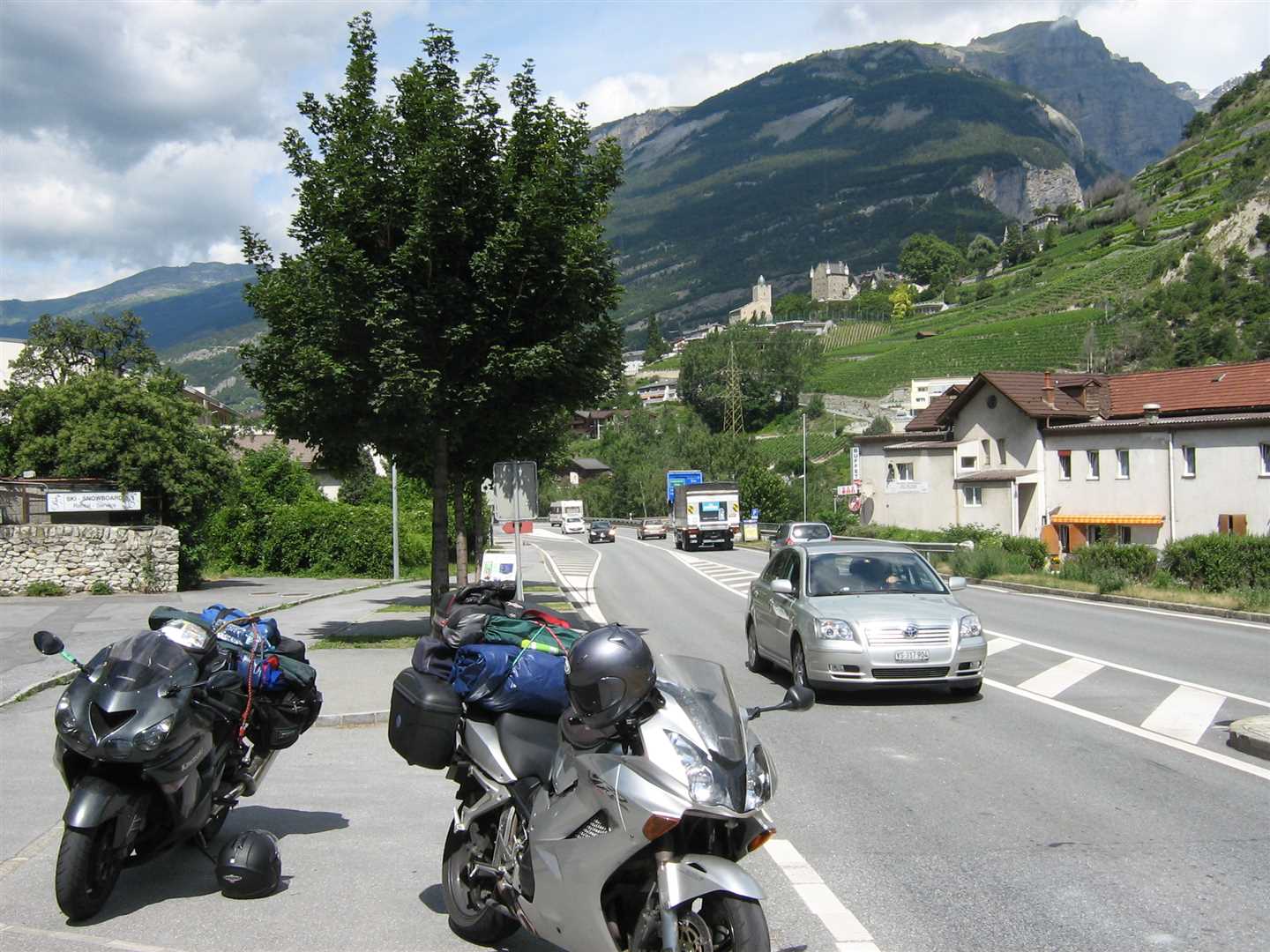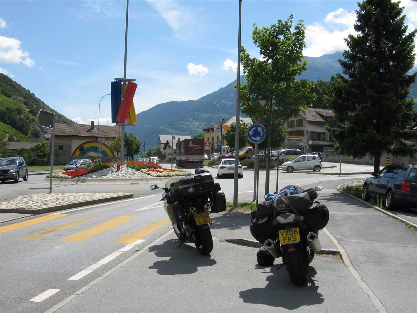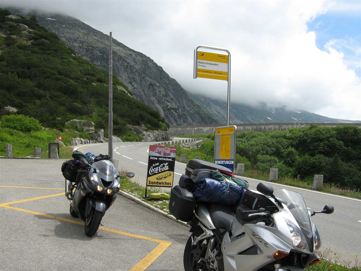 We continued into Switzerland and unfortunately out of the mountains. We were heading east towards the Grimsel Pass, but this meant we had quite a few miles along the lowlands through Switzerland. We had decided not to buy the Swiss vignettes which meant we had to stay off the motorways, which we thought would lead to a more interesting ride. We were wrong, the roads were tedious, 50 mph away from towns 25 mph in towns, no overtaking anywhere, and a lot of Swiss drivers did not like bikes. We decided to ignore the no overtaking nonsense, but even so it was not a nice ride.