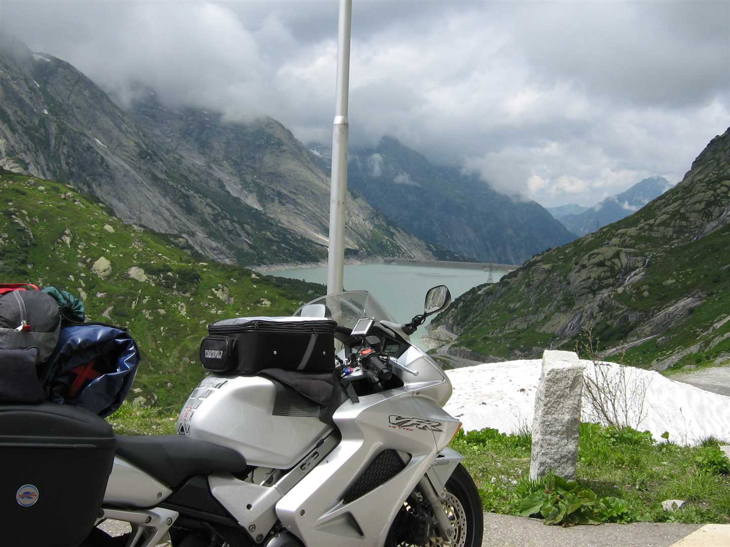 Shortly after lunch though things got better. We started heading back into the mountains and the roads and scenery improved dramatically. Just before we joined the Grimsel Pass we stopped to put a bit more gear on as it had got noticeably cooler and it would be much colder on the top of the pass.