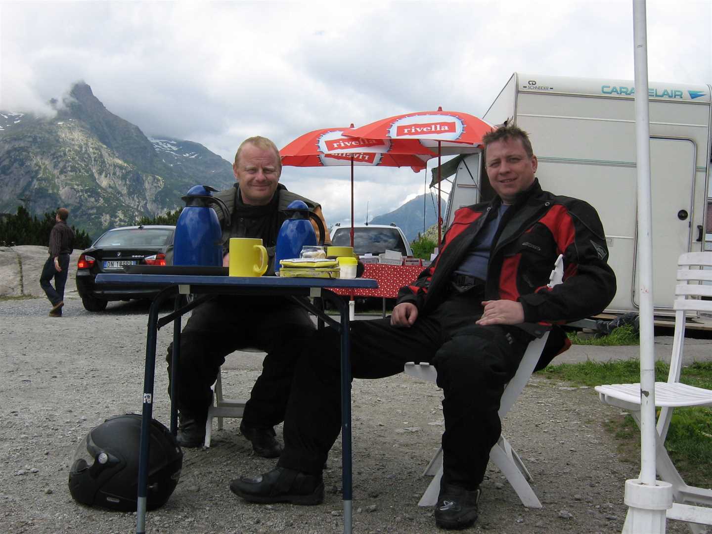 We rode a short distance down before stopping at a little cafe-van. We got a large flask of tea for 3sfr (just short of 2 euros) each. It doesn't get much better than sitting on the side of a mountain in the Alps with your motorbike enjoying a nice cup of tea!