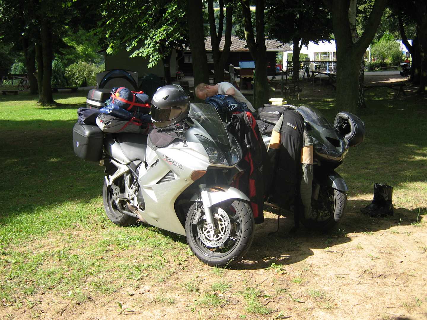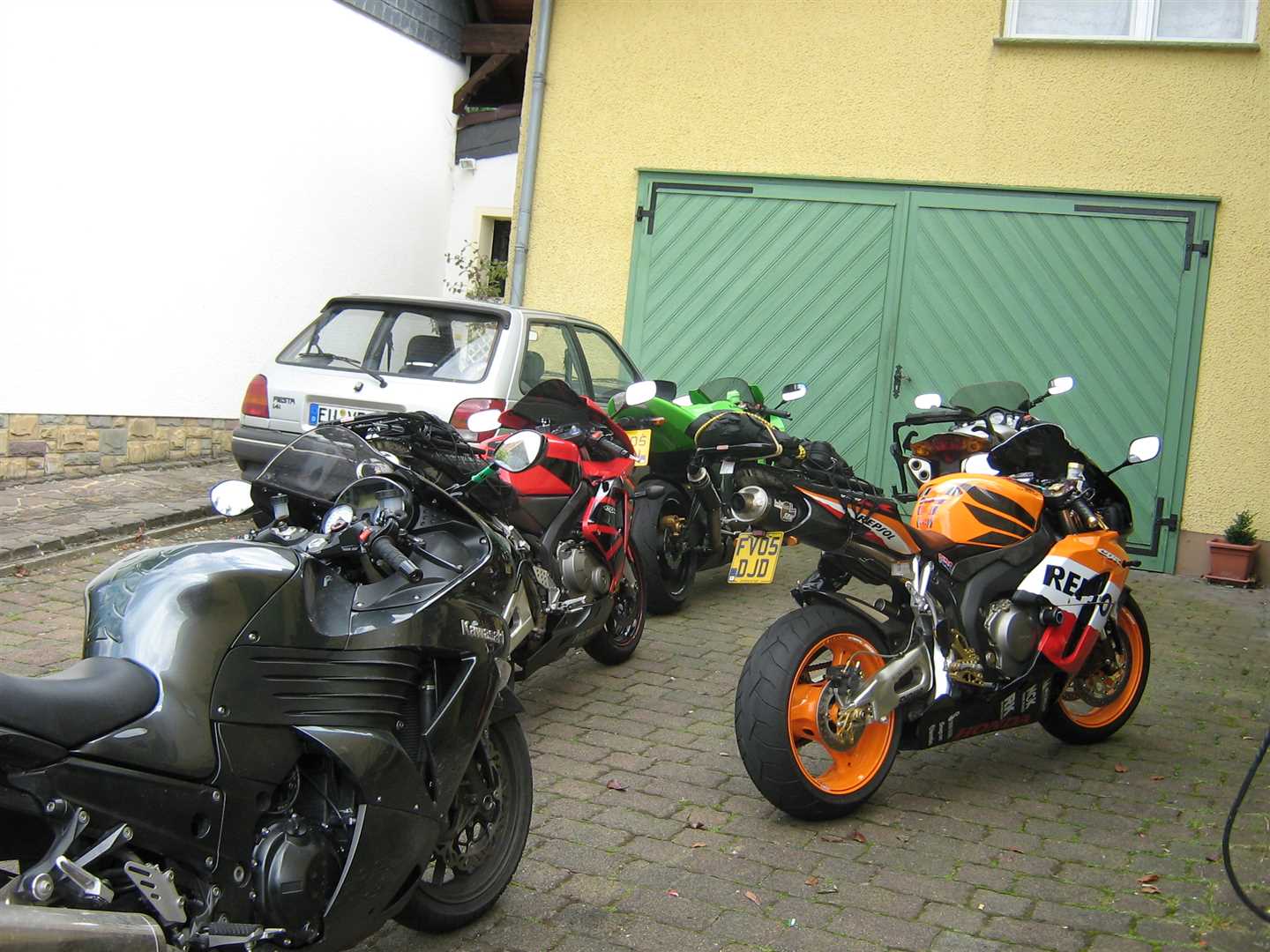 While we were unloading the bikes three other bikers turned up, two on CBR600s and one on a ZX10R. It turned out they were local to Nig, one being very local living literally just around the corner from him. They had been to the Nurburgring before and offered to take us to the 'ring and show us what you do. We also learnt that the 'ring generally only opens to the public for a couple of hours each evening, 5:30pm and 7:30pm which we didn't know, so it was just as well we met up with them.