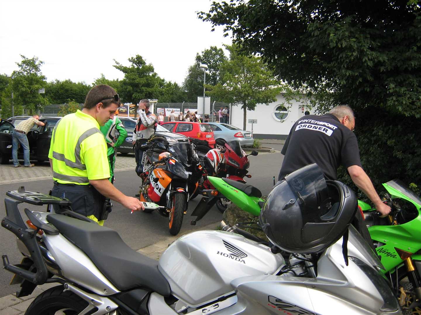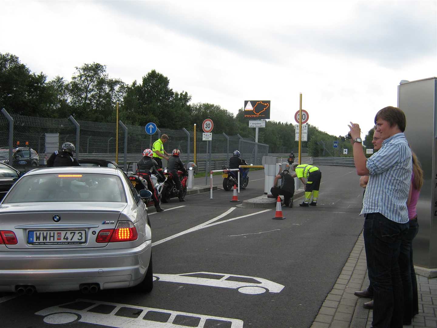 We chilled out for a bit and then had a very leisurely ride to the 'ring, following our new-found companions. We got to the 'ring at around 4:30, bought our tickets (75 euros for 2 laps each) and watched a couple of SLKs being tested by Mercedes, it was very impressive to watch them shoot past on the long straight. While we were waiting the marshals had spotted the after-market pipes on the CBRs and ZX10R we had turned up with and asked if they could test the sound levels. The 'ring has a strict 100db limit, a luckily for these guys their bikes just scrapped in, the ZX10R being exactly 100db! I was very impressed with the marshals though - they are friendly, helpful and just want you to enjoy yourself.
