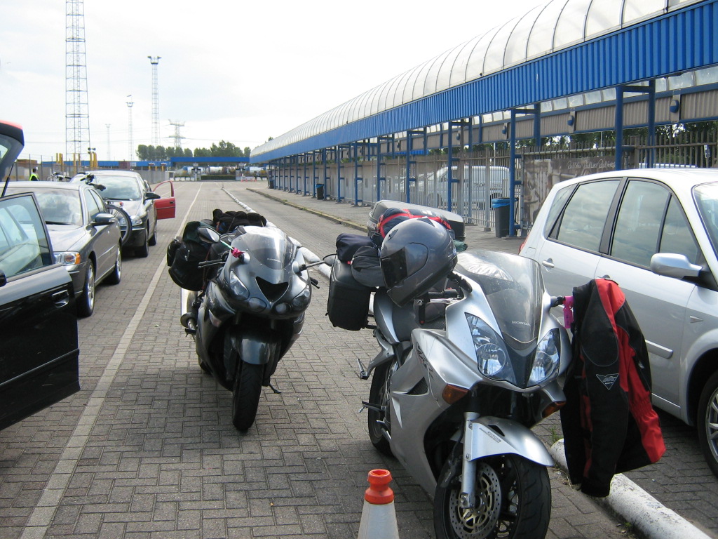 We got to the docks at around 3pm, as usual there was nothing there so we just chilled out by the bikes and nattered with the other travellers around us. There was an older couple on an old Goldwing; they'd toured down through Germany to Italy and back, on the way the exhaust had broken and the old fella had fixed it with a bean can! Top lad! There was also a couple on a BMW who were really into touring the BMW way. It become very clear that we were the only ones who had encounted consistantly good weather!