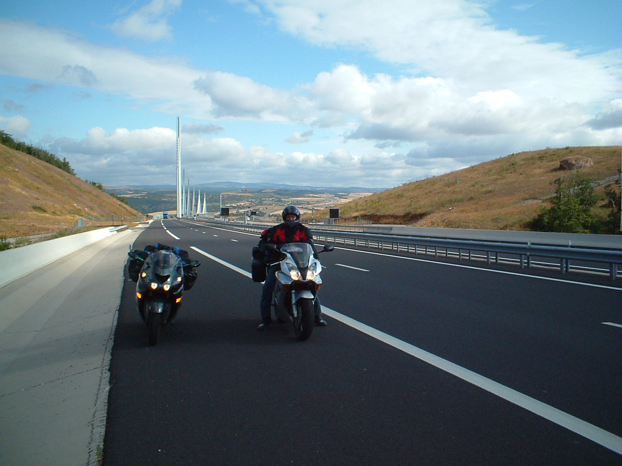 We set off and headed for the Millau Viaduct. We initially went to the viewing area for some photo's and then headed over the bridge. It was around 3.80 euros each for us to cross the bridge, we took it steady going across and enjoyed the amazing view. Then we stopped just over the bridge and Nig took a couple of pictures of the bikes with the bridge in the background.