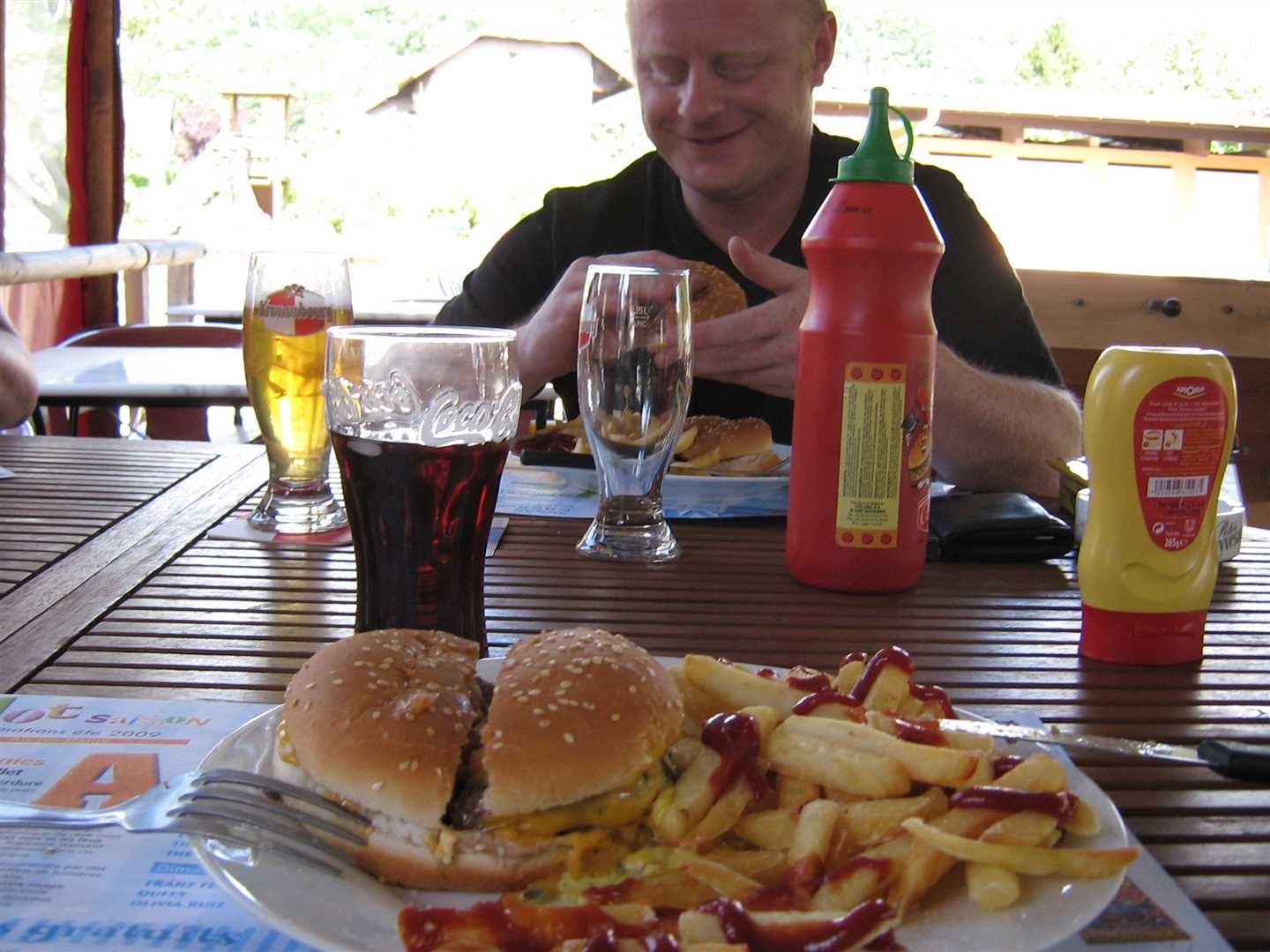 Then we went for something to eat. We both had burger and chips and it was one of the best burgers I've ever had! While we were eating our food another English biker checked in. He was called Dave and was from Wigan. He was touring on his own on a BMW bike. He had ridden down through Germany, Switzerland, and Austria and had pretty bad luck with the weather, getting wet and cold for a lot of the journey. He was very pleased the finally see some sun and finally be warm!