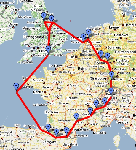 Day 1 - Bradford/Scunthorpe to Portsmouth Day 2 - Sailing to Bilbao (Spain) Day 3 - Bilbao (Spain) to Ezkaroze (Spain) Day 4 - Ezkaroze (Spain) to Ainsa (Spain) Day 5 - Ainsa (Spain) to Andorra Day 6 - Andorra to Millau (France) Day 7 - Millau (France) to Crest (France) Day 8 - Crest (France) to Chambery (France) Day 9 - Chambery (France) to Aosta (Italy) Day 10 - Aosta (Italy) to Hasliberg (Switzerland) Day 11 - Hasliberg (Switzerland) to Schapbach (Germany) Day 12 - Schapbach (Germany) to Loreley (Germany) Day 13 - Loreley (Germany) to Nurburgring (Germany) Day 14 - Nurburgring (Germany) to Amsterdam (Holland) Day 15 - Amsterdam (Holland) to Rotterdam (Holland) Day 16 - Hull to Bradford/Scunthorpe Route Bikes Luggage Diary