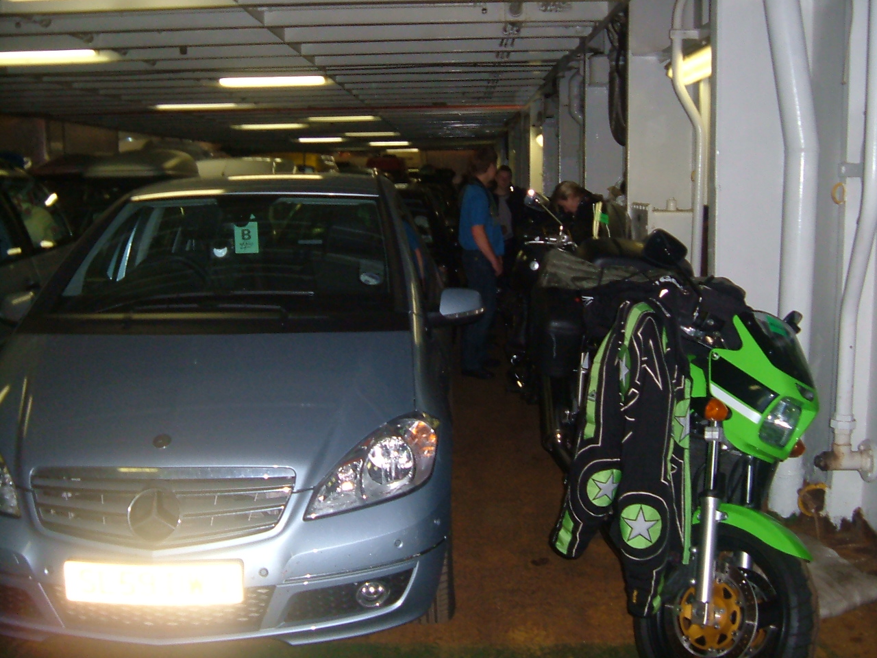 This is a frantic and exhausting time for us bikers. First of all we had to carry all our gear back to the bikes through tight corridors and even tighter gaps between cars while wearing all our gear. Then we had to untie our bikes and repack them in a very confined space. By this time the doors had opened and the first few vehicles were moving off. We had to be quick about it because, as is usually the case, we were blocking a load of other bikers, who all seemed a lot better at this than we were and were ready to set off while I was still trying to secure my tank bag.